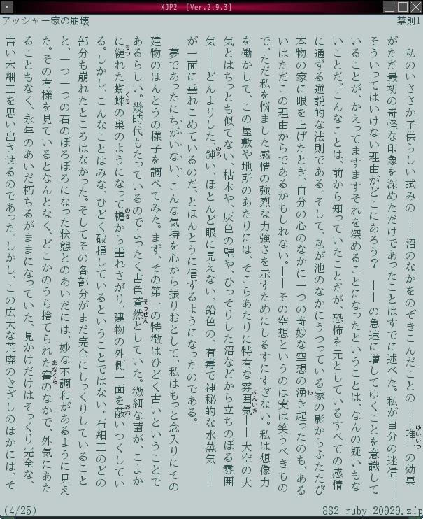 紙の本を読むのに慣れていると、小説や物語などを読む場合にはテキストデータも横書き形式ではなく縦書き形式でないと、どうにも雰囲気が出ない気分になる事があります。このページでは、debian squeeze 上で、青空文庫向け縦書きビューワー xjp2 を使ってテキストデータを縦書き形式で読む為の方法をメモしておきます。
